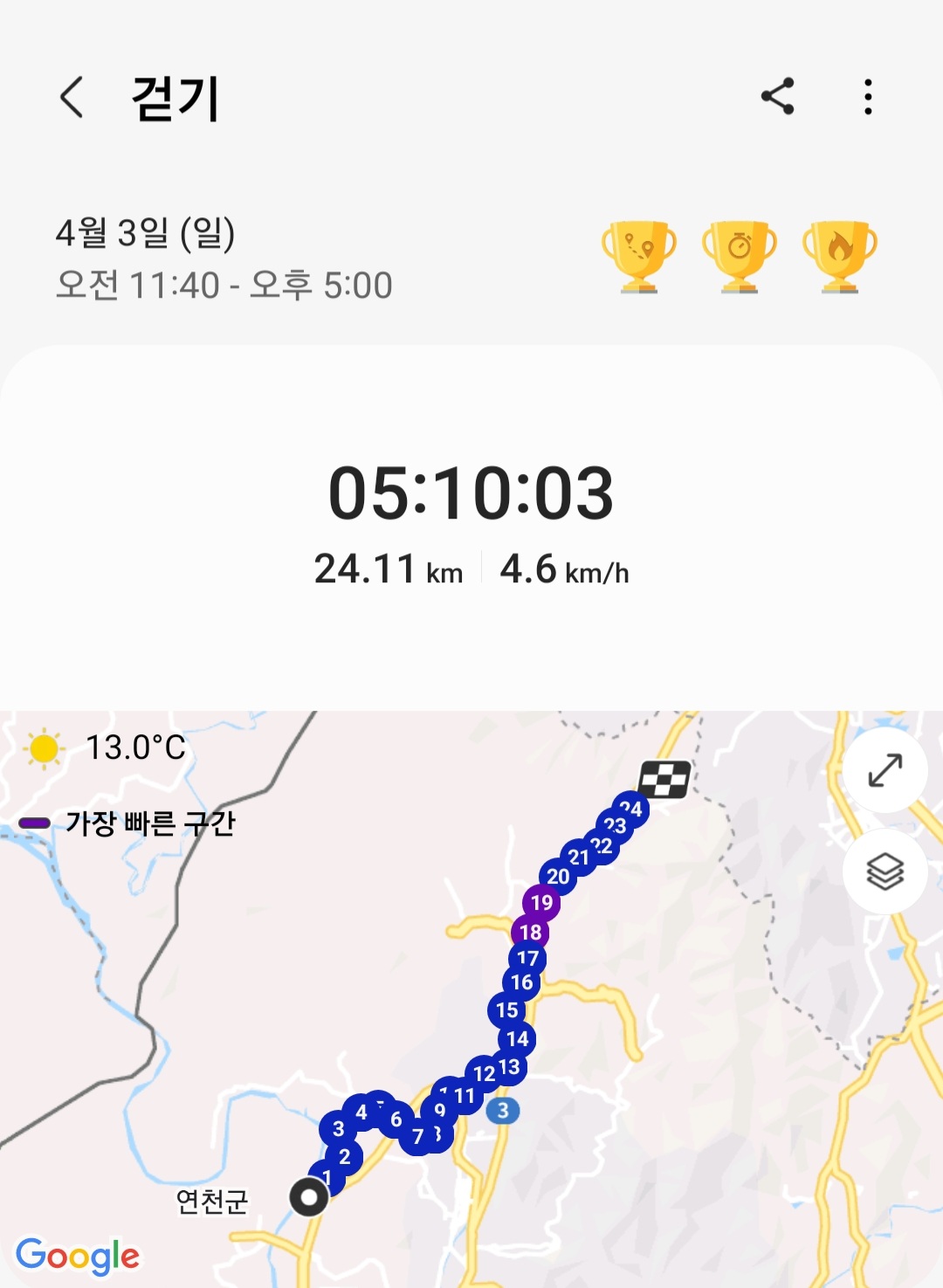 ▶ 실제 총거리 : 24.11km (갤럭시 워치4 기록)