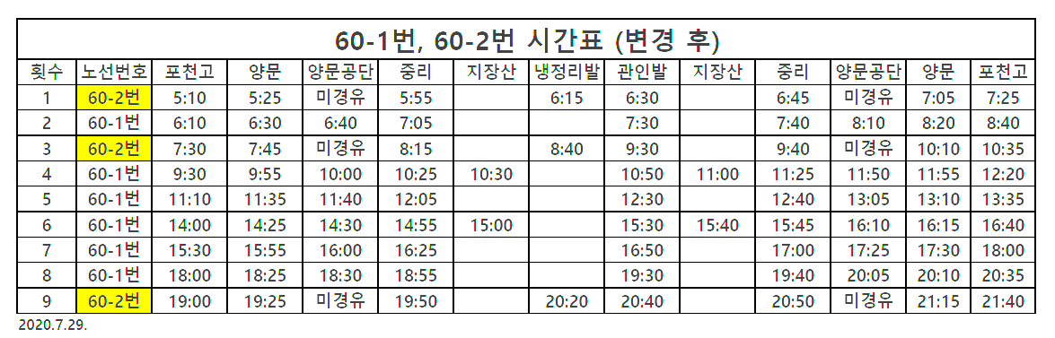 (포천 60-1, 60-2 버스 시간표 사진 참고)