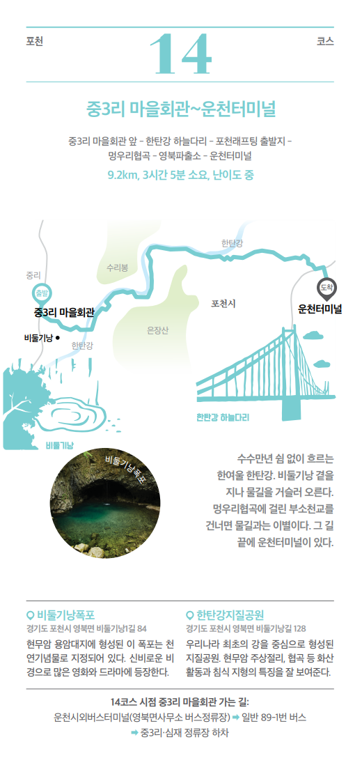▶ 주요 코스 : 중3리 마을회관 앞 ~ 한탄강 하늘다리 ~ 멍우리협곡 ~ 영북파출소 ~ 운천터미널