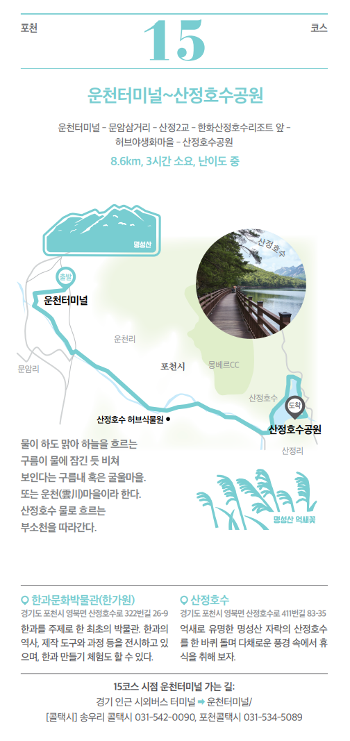 ▶ 주요 코스 : 운천터미널 ~ 문암삼거리 ~ 산정2교 ~ 한화산정호수리조트 앞 ~ 허브야생화마을 ~ 산정호수공원