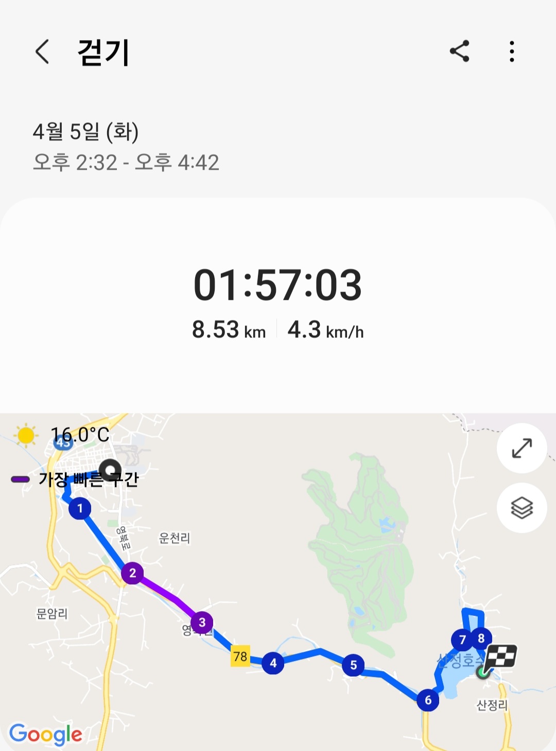 ▶ 실제 총거리 : 8.53km (갤럭시 워치4 기록)