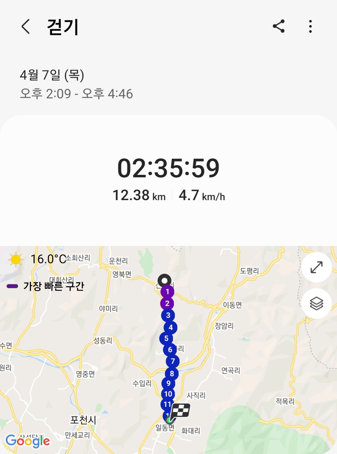 ▶ 실제 총거리 : 12.38km (갤럭시 워치4 기록)
